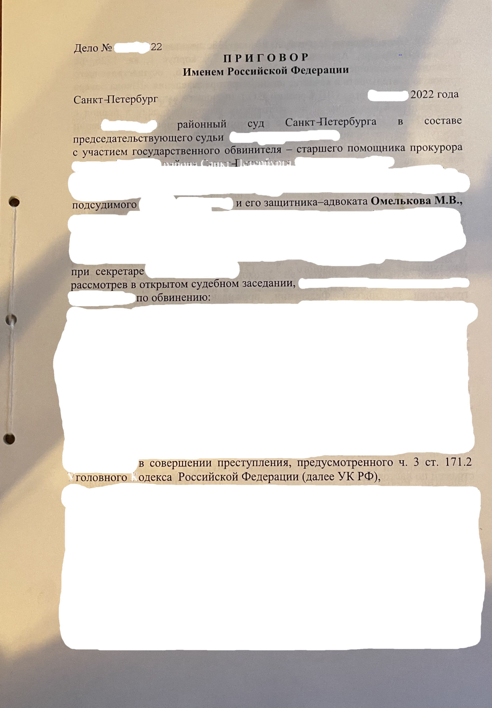 Доверитель обвинялся в совершении преступления предусмотренного ч. 3 ст. 171.2 УК РФ (незаконная организация и проведение азартных игр, совершенные организованной группой, максимальное наказание до 6-ти лет лишения свободы). В ходе рассмотрения уголовного дела по существу, стороне защиты удалось убедить суд и переквалифицировать действия Доверителя на ч. 2 ст. 171.2 УК РФ и освободить его от отбытия наказания.